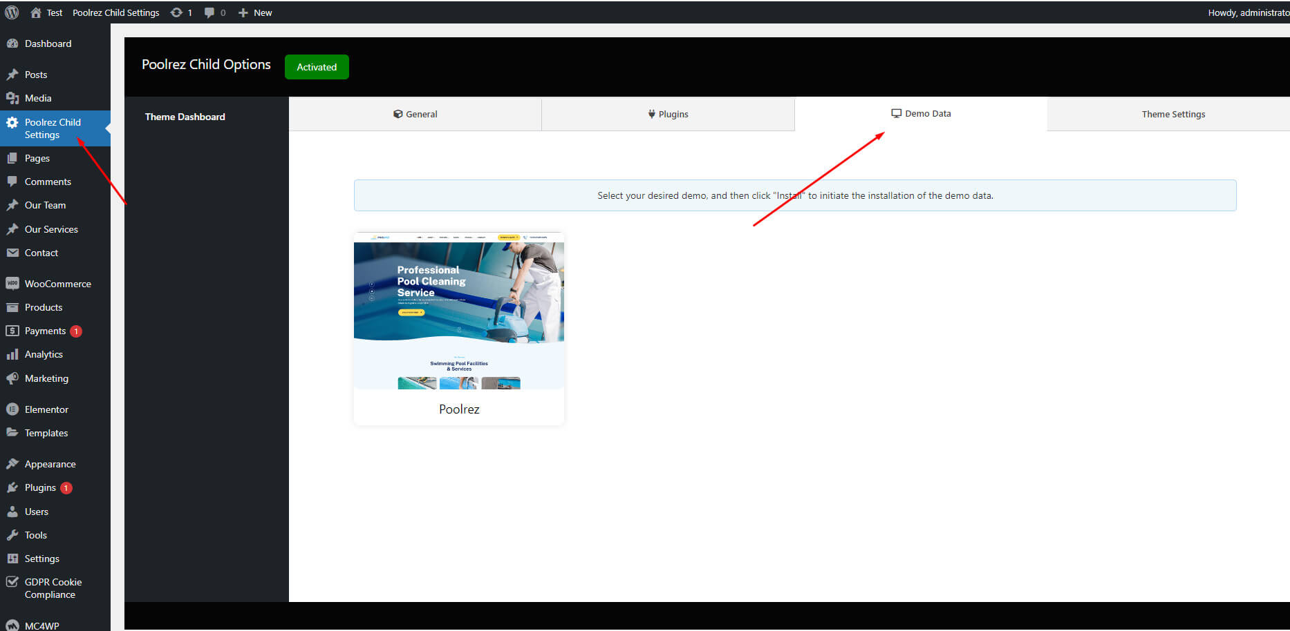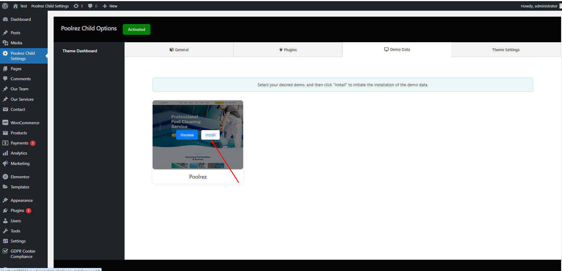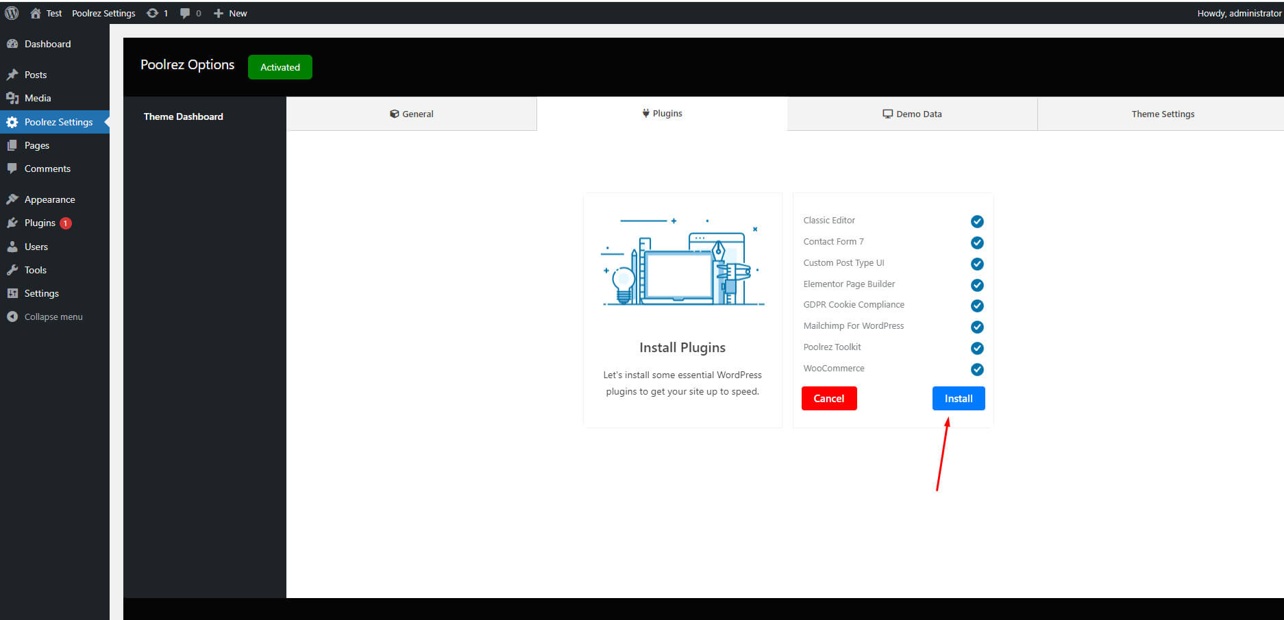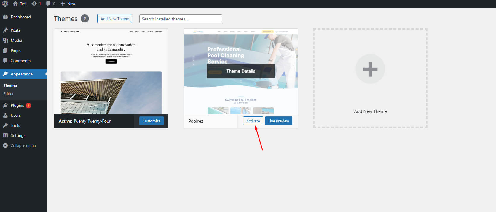 - When the installation completes, click Activate. You will be redirected to Themes page with Poolrez activated.